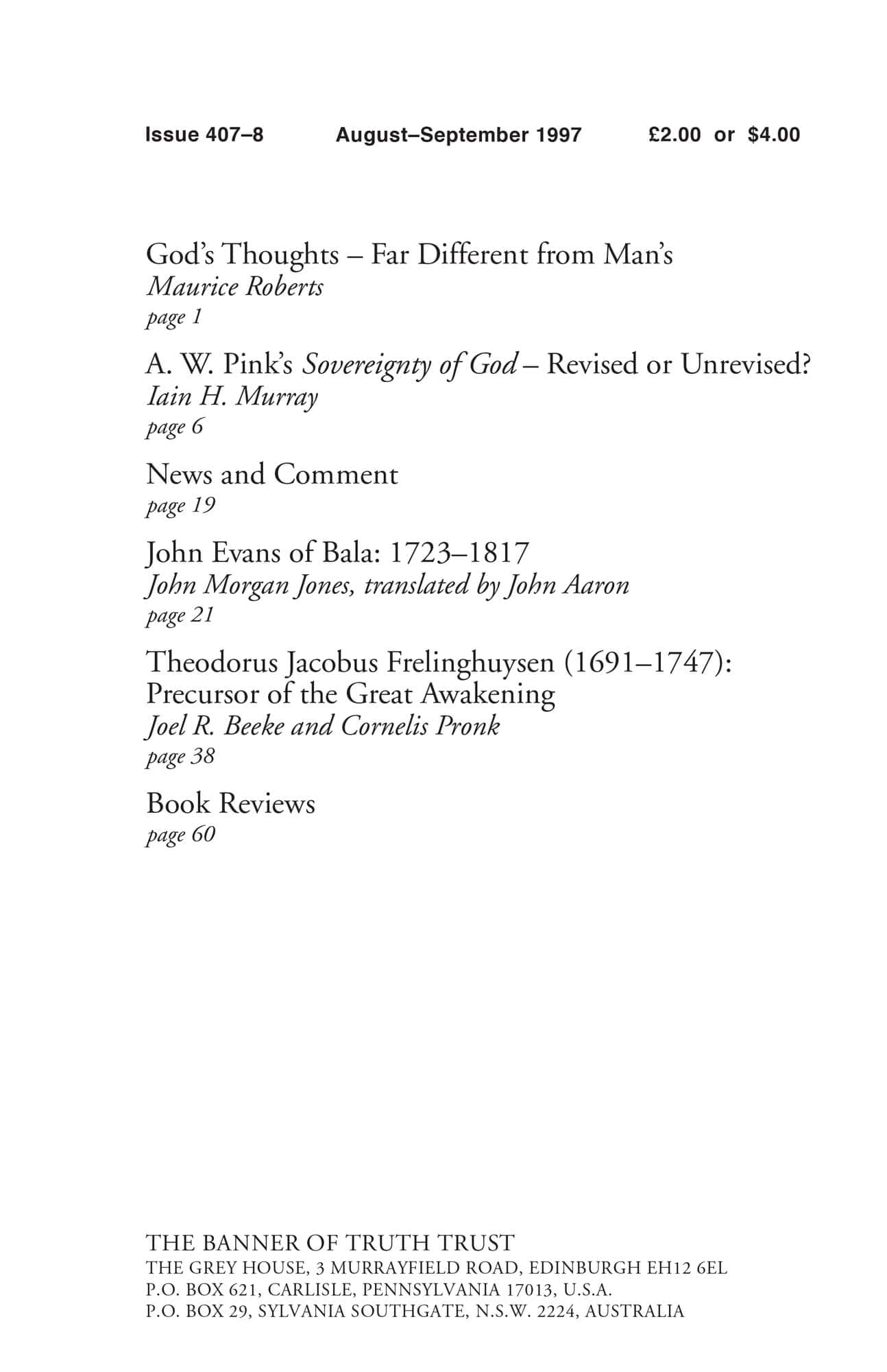 | A W Pink’s Sovereignty of God: Revised or Unrevised? — Murray, Iain H | 6-18 |