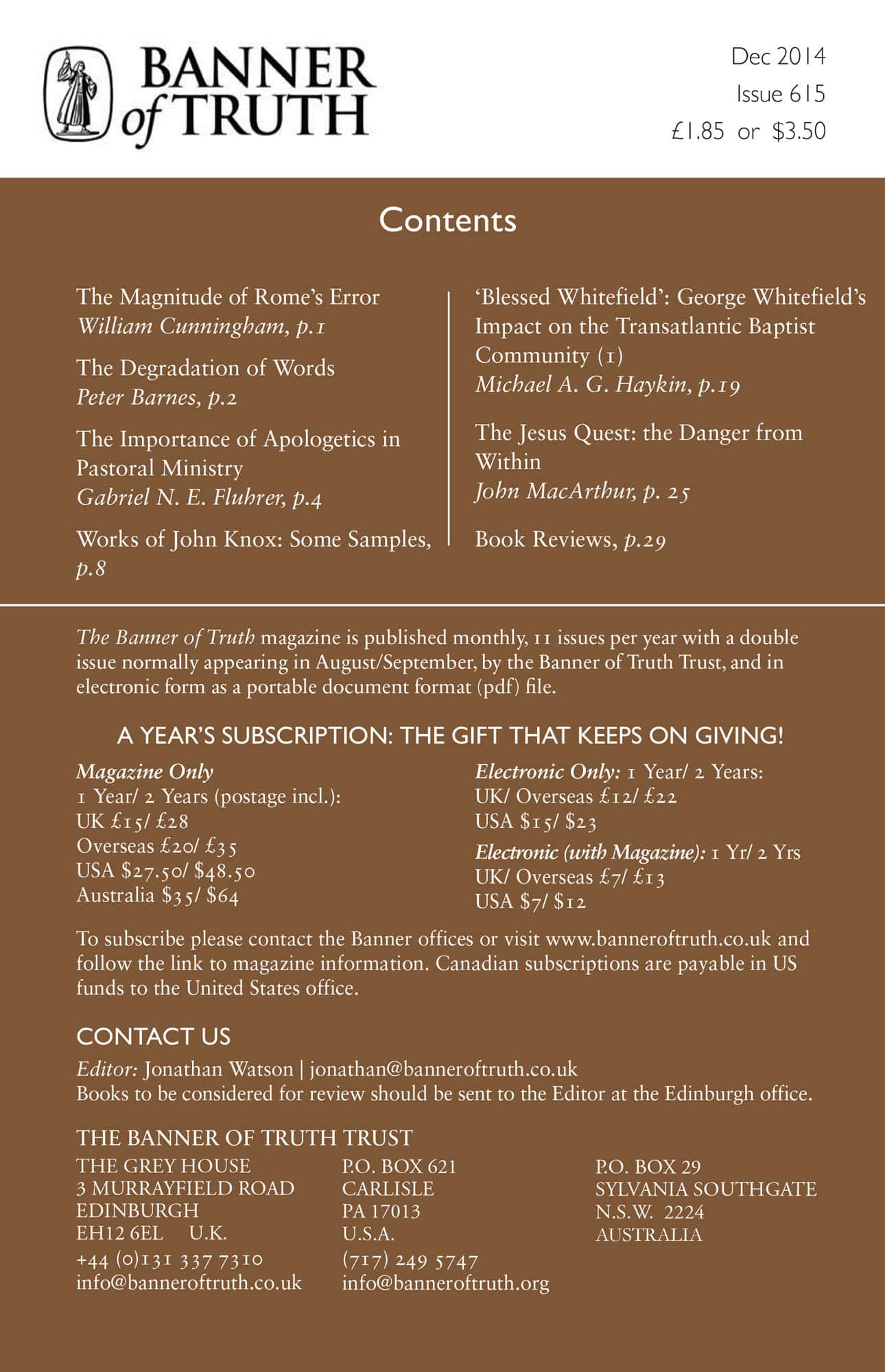 Subscribe to the Banner of Truth Magazine for 11 edifying issues each year (including summer double issue).