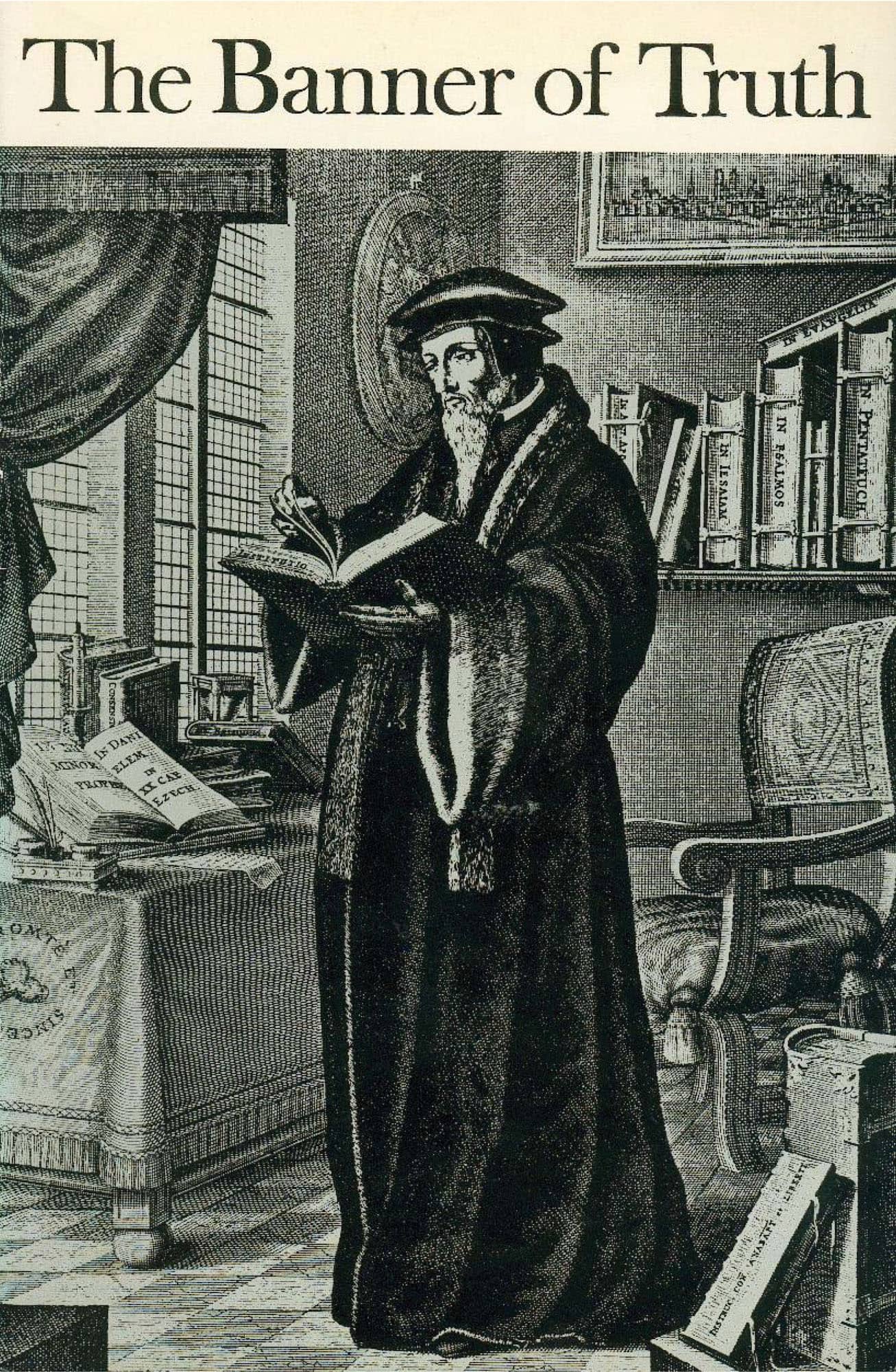 This binder holds two years’ issues and is made of stout board, with wire rods to hold the magazine in place. The name ‘Banner of Truth’ is stamped in gold on a black panel on the grey cloth.