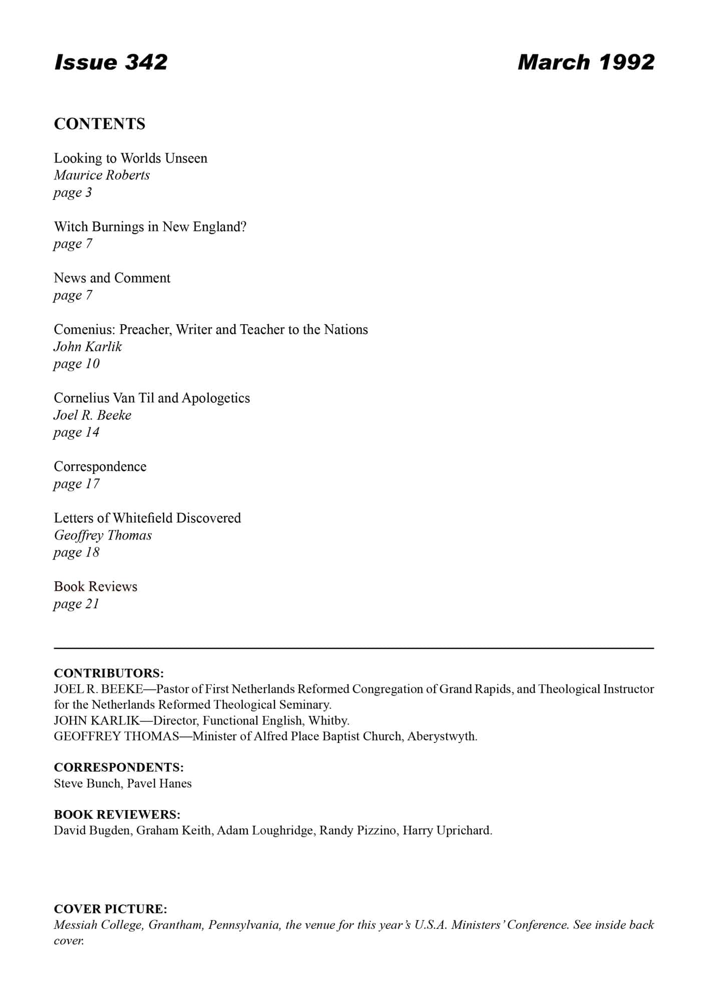 | Comenius: Preacher Writer and Teacher to the Nations — Karlik, John | 11-16 |