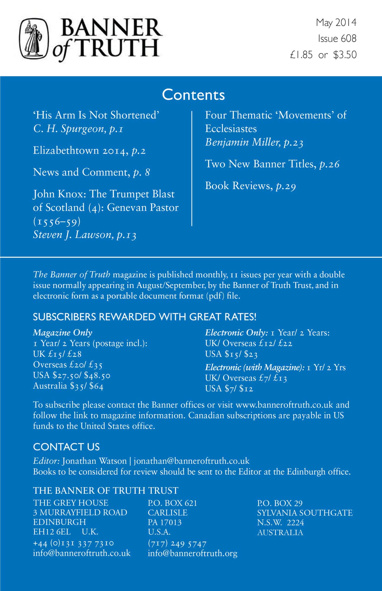 Subscribe to the Banner of Truth Magazine for 11 edifying issues each year (including summer double issue). Table of Contents O Jerusalem, Jerusalem — Thomas, Geoffrey 1-5 Changing Scene in the United States — Murray, Iain H 10-16 Zeal to Promote the Common Good – The Story of the King James Bible – 1 — […]
