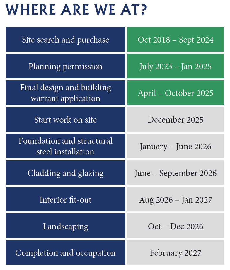 The table below highlights the key events of the project and estimated timeframes. Each box highlighted in green indicates a completed task.