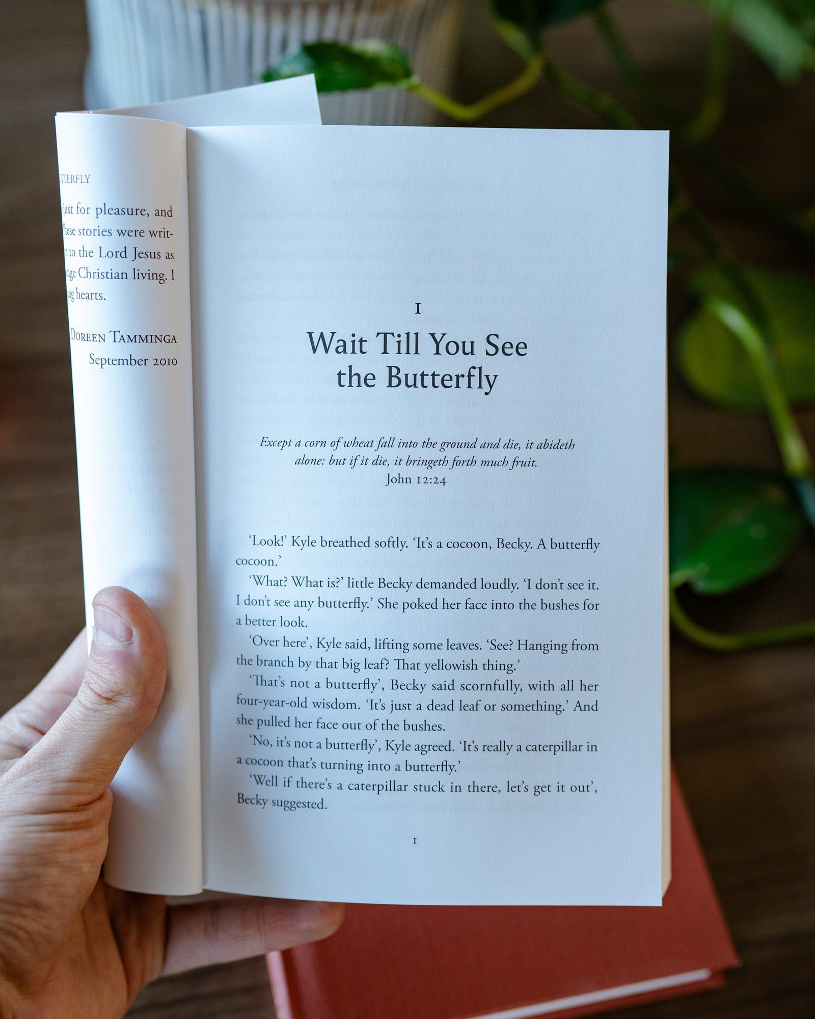 Our family just finished reading through this book for the second time and were blessed by it once again. Tamminga has a real gift at writing a rich variety of stories that point the reader to Christ; whether the reader be two years old or in their adult years. My kids would ask everyday if it was time for the ‘butterfly book’ yet . This is definitely a book I would recommend to others and plan to pick up once again in the coming years.