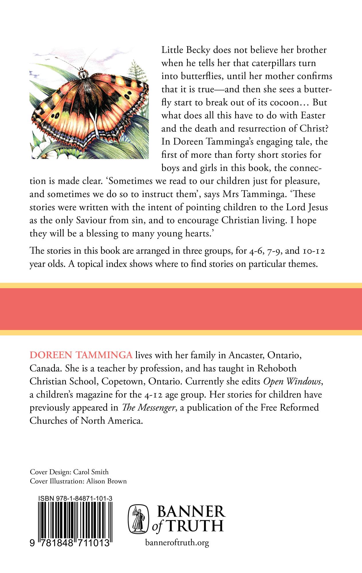 Little Becky does not believe her brother when he tells her that caterpillars turn into butterflies, until her mother confirms that it is true – and then she sees a butterfly start to break out of its cocoon…But what does all this have to do with Easter and the death and resurrection of Christ? In Doreen Tamminga’s engaging tale, the first of more than forty short stories for boys and girls in this book, the connection is made clear. ‘Sometimes we read to our children just for pleasure, and sometimes we do so to instruct them’, says Mrs. Tamminga. ‘These stories were written with the intent of pointing children to the Lord Jesus as the only Saviour from sin, and to encourage Christian living. I hope they will be a blessing to many young hearts.’