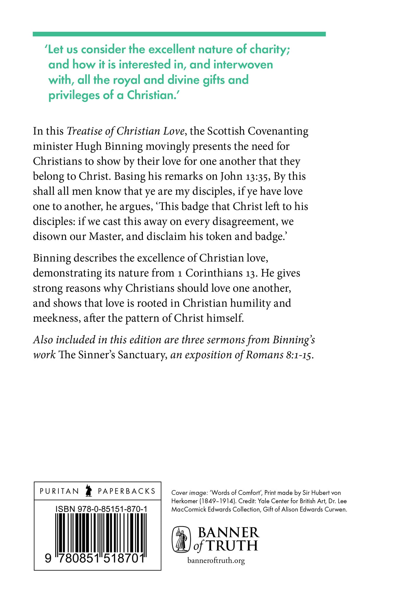 The Scottish Covenanting minister Hugh Binning shows how Christians should love one another (John 13:35) and describes the excellence of Christian love from 1 Corinthians 13. Includes 3 sermons from The Sinner’s Sanctuary, an exposition of Romans 8:1–15. 112pp.