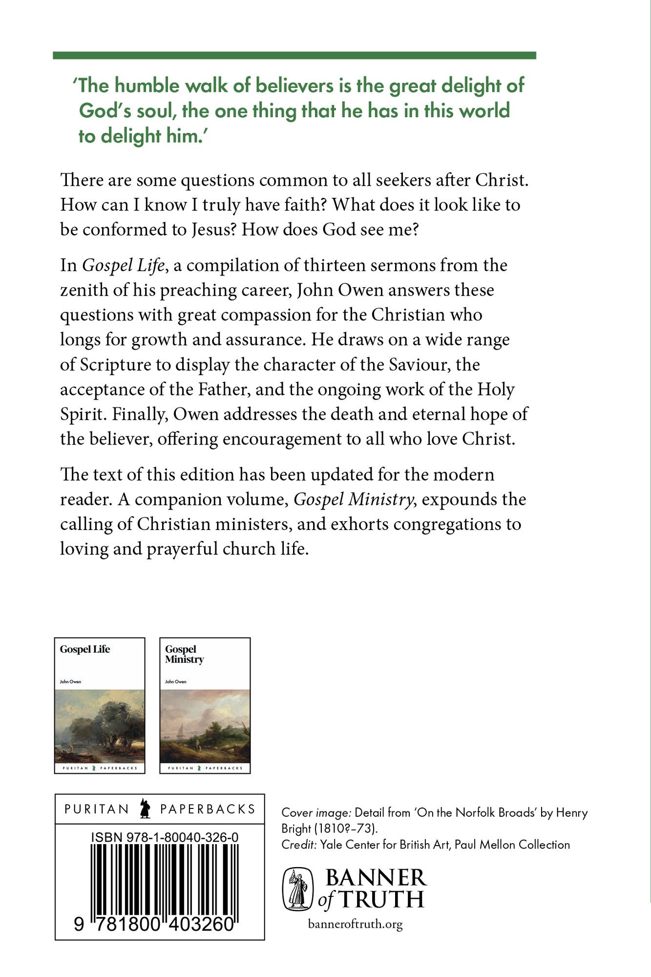 In Gospel Life, a posthumous compilation of thirteen sermons from the zenith of his preaching career, John Owen answers these questions with great compassion for the Christian who longs for growth and assurance. He draws on a wide range of Scripture to display the character of the Savior, the acceptance of the Father, and the ongoing work of the Holy Spirit. Finally, Owen addresses the death and eternal hope of the believer, offering encouragement to all who love Christ.