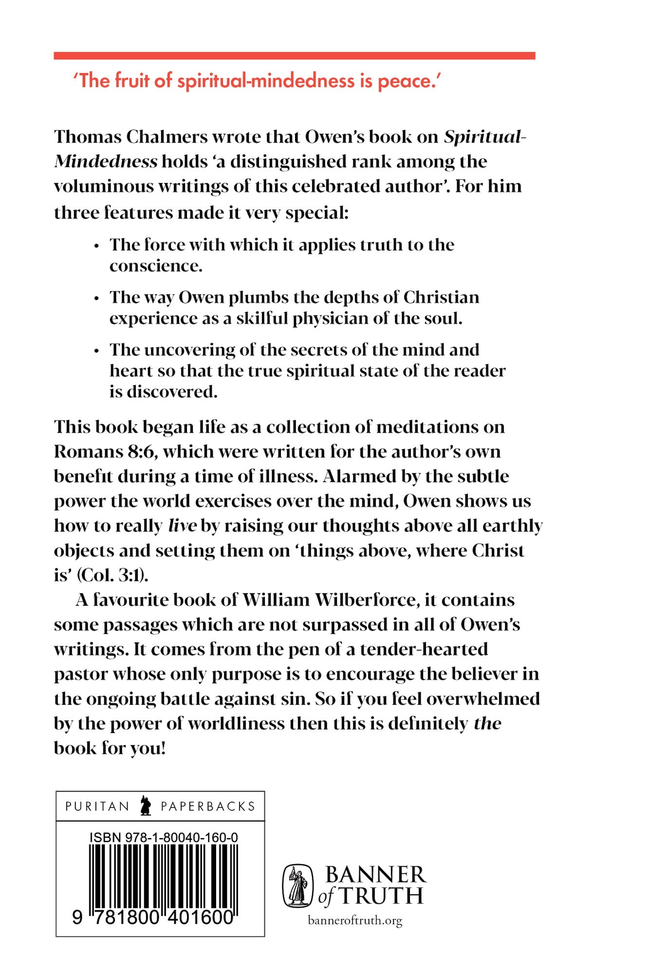 Thomas Chalmers wrote that Owen’s book on Spiritual-Mindedness holds ‘a distinguished rank among the voluminous writings of this celebrated author’. For him three features made it very special:
