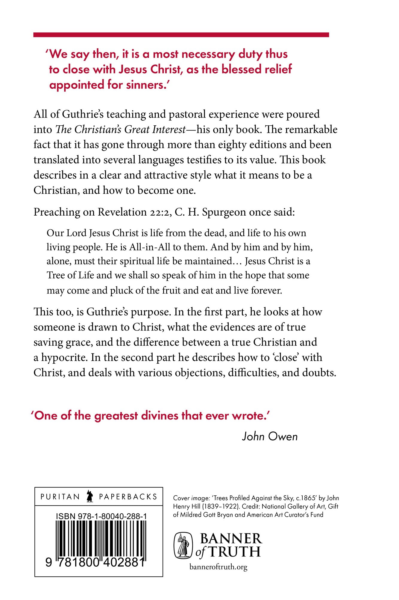 All of Guthrie’s teaching and pastoral experience were poured into The Christian’s Great Interest – his only book. The remarkable fact that it has gone through more than eighty editions and been translated into several languages testifies to its value. This book describes in a clear and attractive style what it means to be a Christian, and how to become one.