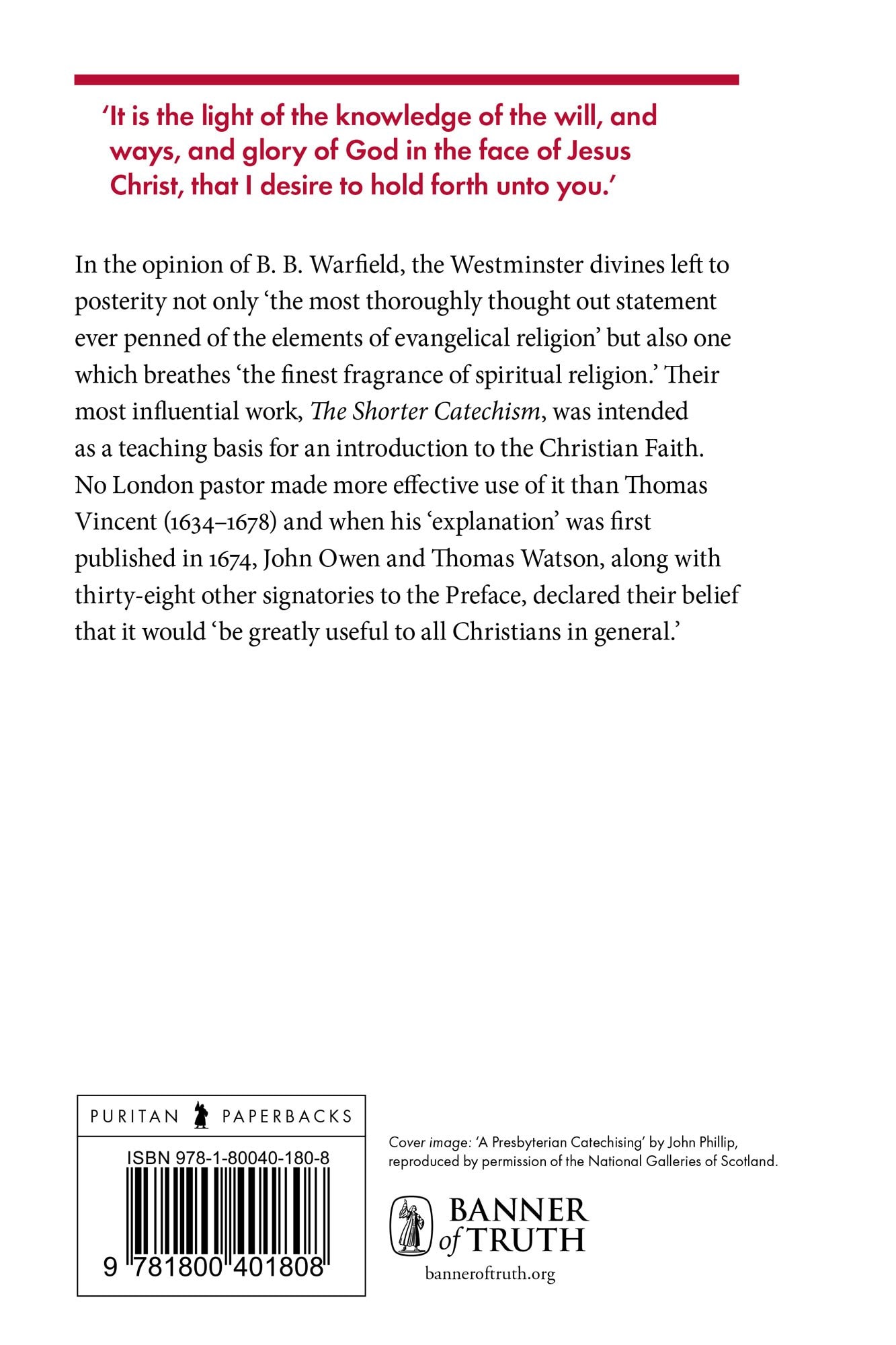 In the opinion of B.B. Warfield, the Westminster divines left to posterity not only ‘the most thoroughly thought out statement ever penned of the elements of evangelical religion,’ but also one which breathes ‘the finest fragrance of spiritual religion.’ Their most influential work, the Shorter Catechism, was intended as a teaching basis for an introduction to the Christian faith. No London pastor made more effective use of it than Thomas Vincent (1634–1678), and when his ‘explanation’(The Shorter Catechism Explained from Scripture) was first published in 1674, John Owen, Thomas Watson along with 38 other signatories to the Preface, declared their belief that it would ‘be greatly useful to all Christians in general.’