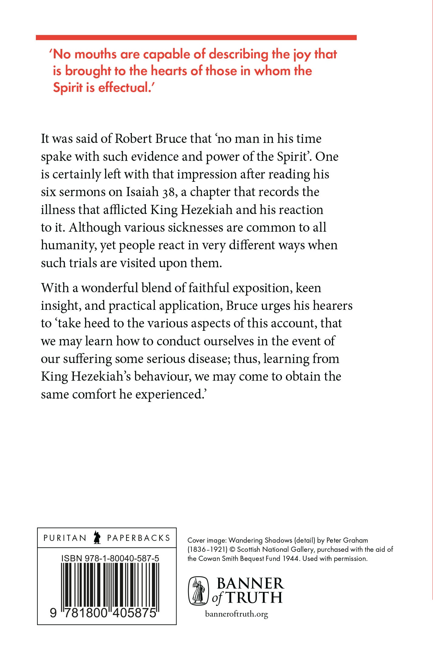 With a wonderful blend of faithful exposition, keen insight, and practical application, Bruce urges his hearers to ‘take heed to the various aspects of this account, that we may learn how to conduct ourselves in the event of our suffering some serious disease; thus, learning from King Hezekiah’s behaviour, we may come to obtain the same comfort he experienced.’