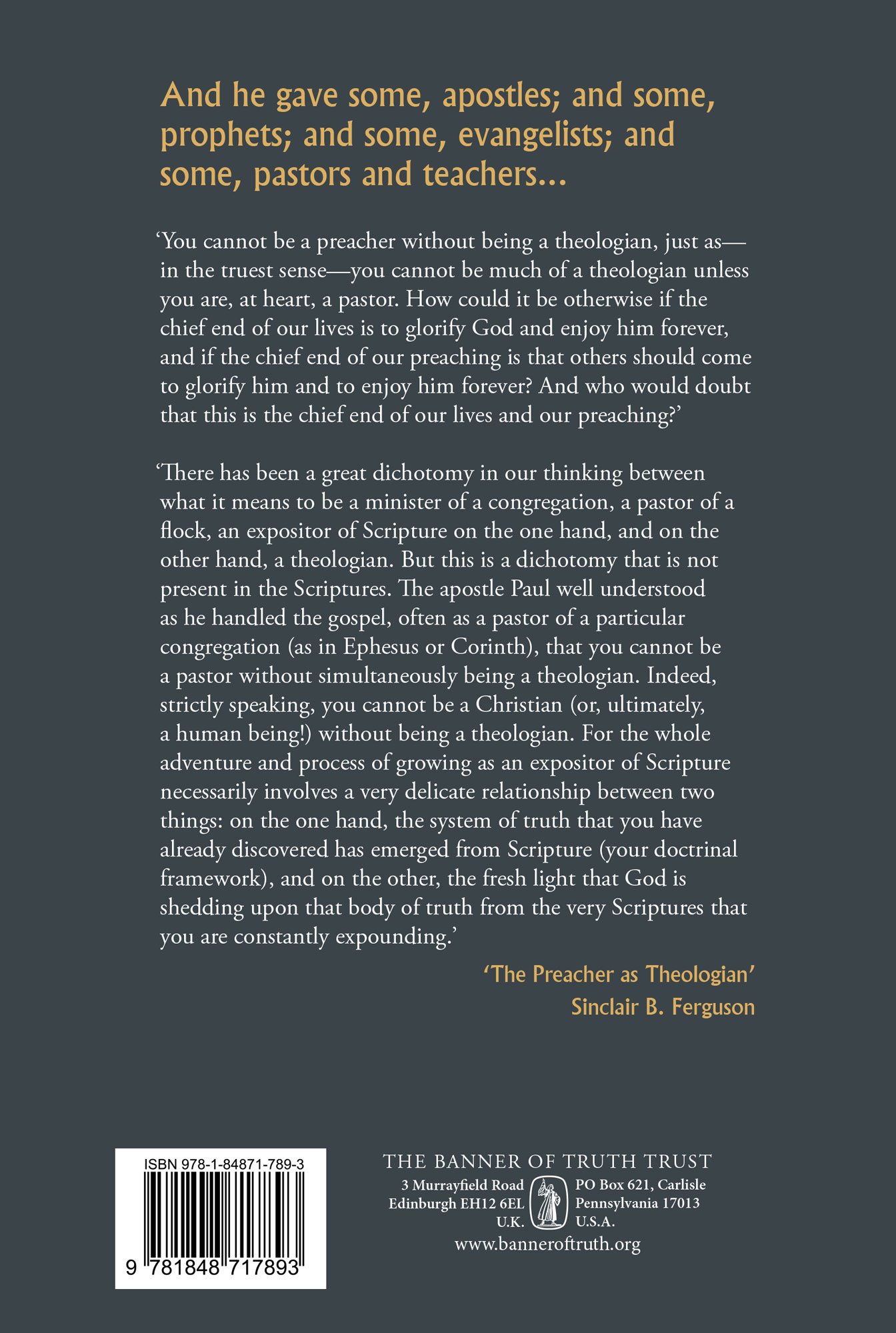 ‘Some Pastors and Teachers will bring Sinclair Ferguson into your life as an inspiring teacher and at times as a gentle goad, helping you fan into flame the gift of God which is in you, so that you fulfill your ministry (2 Tim. 1:6; 4:5).’ — RAY ORTLUND