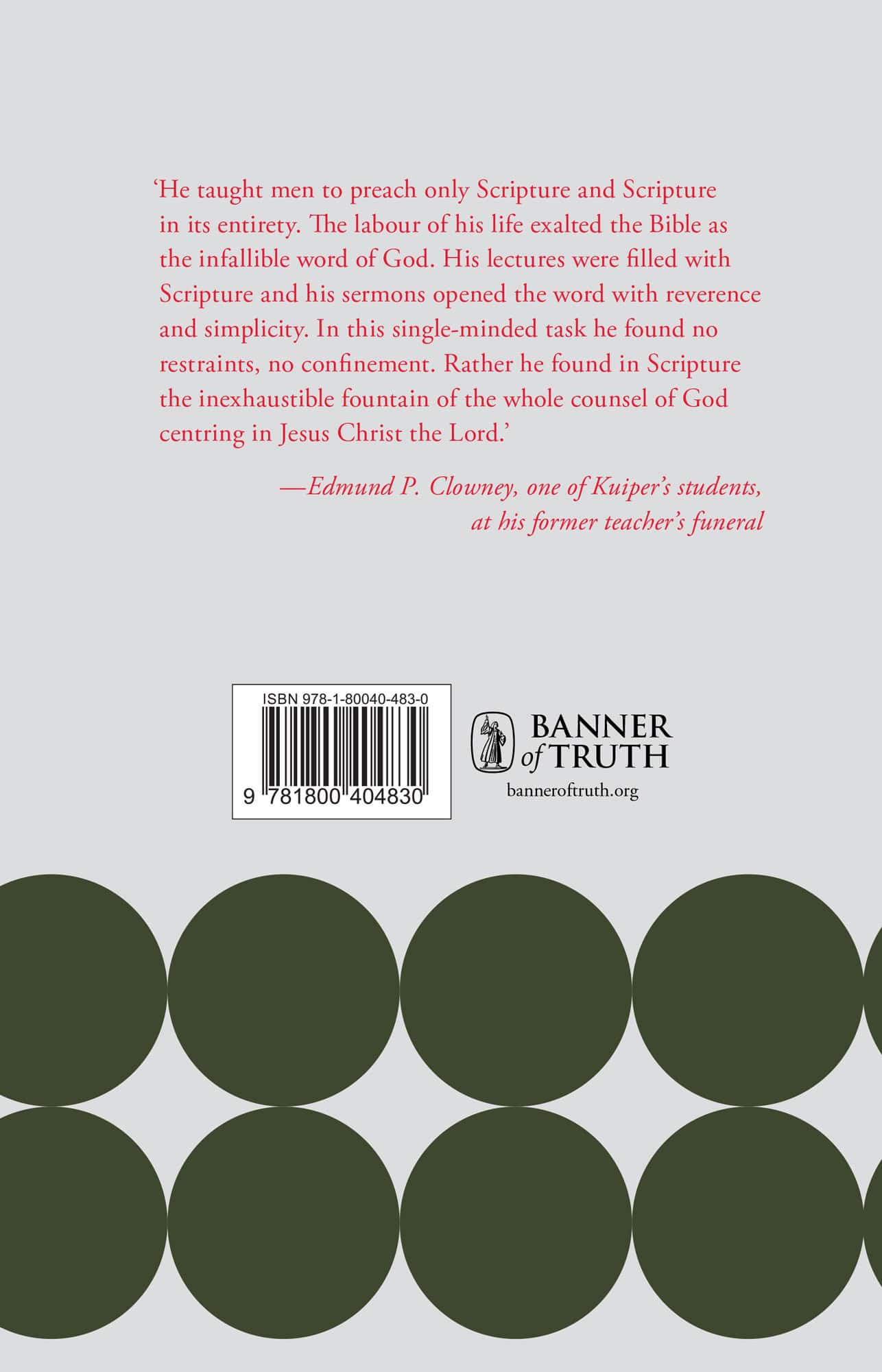 ‘He taught men to preach only Scripture and Scripture in its entirety. The labour of his life exalted the Bible as the infallible word of God. His lectures were filled with Scripture and his sermons opened the word with reverence and simplicity. In this single-minded task he found no restraints, no confinement. Rather he found in Scripture the inexhaustible fountain of the whole counsel of God centering in Jesus Christ as Lord.’ — EDMUND P. CLOWNEY, one of Kuiper’s students, at his former teacher’s funeral