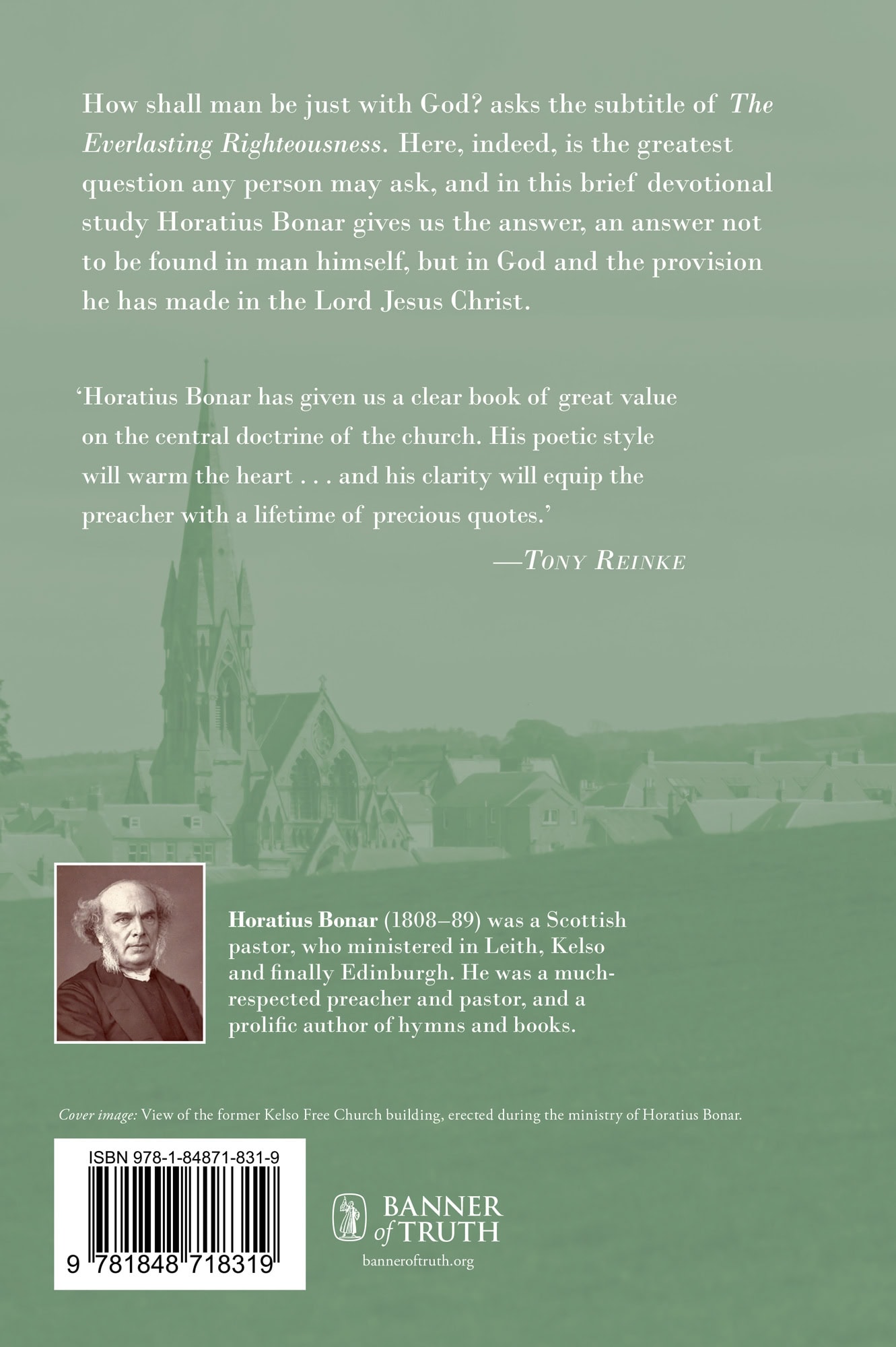 ‘Written in 1874 and republished by The Banner of Truth in 1993, The Everlasting Righteousness stands (in my opinion) as the greatest book on the importance of the Cross and our imputed righteousness. It is clear, concise, devotional and beautifully written…. If you are looking for a readable book that exalts the Cross-centered life, relishes in the righteousness found only in the substitution of the Lamb, and magnifies the worth and beauty of Christ, turn to a talented hymn writer. Horatius Bonar has given us a clear book of great value on the central doctrine of the church. His poetic style will warm the heart after multiple readings and his clarity will equip the preacher with a lifetime of precious quotes.’ — TONY REINKE