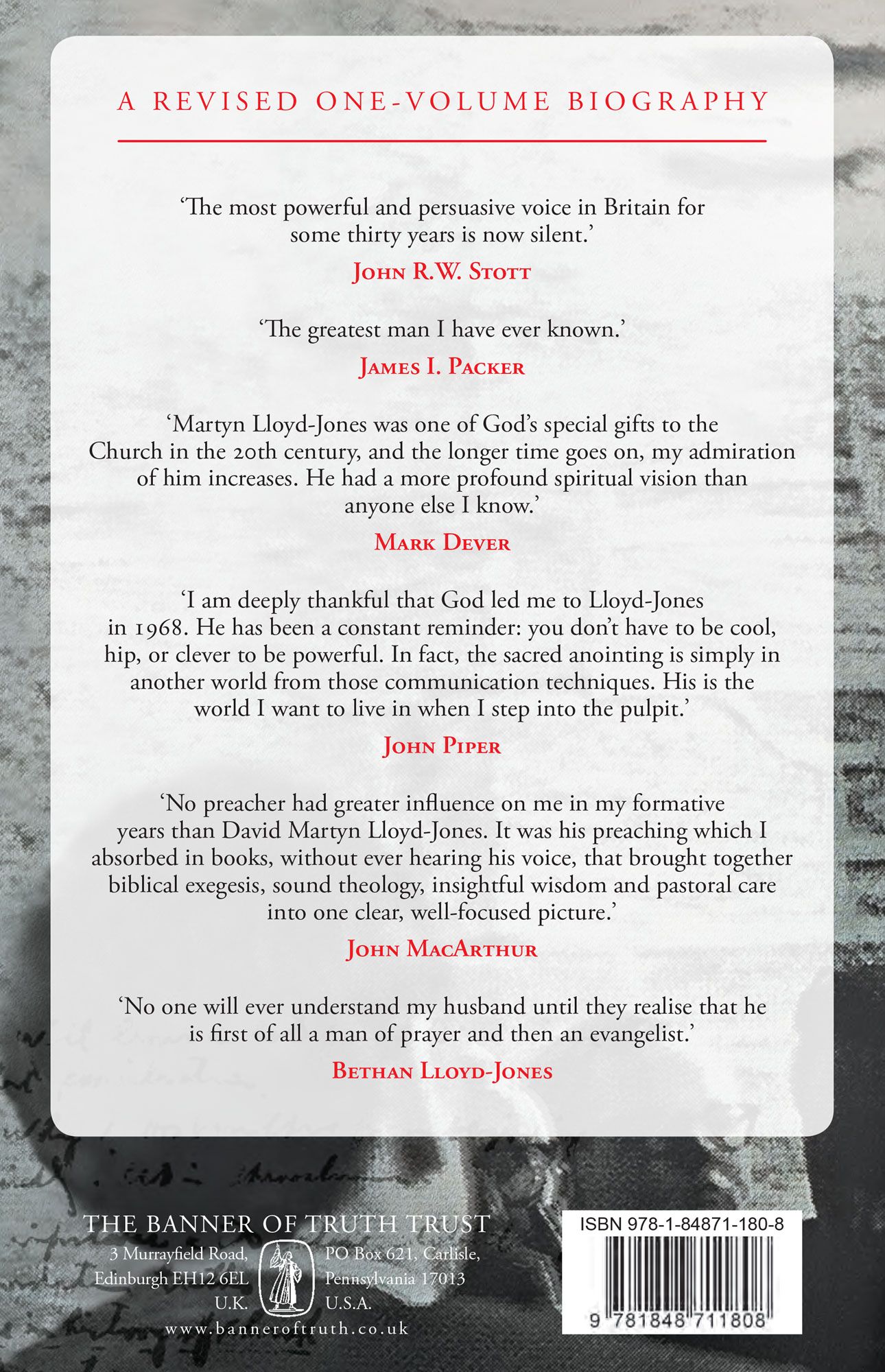 I first heard of Dr. ML-J when I picked up a small book called “Authority”, of which I was compeled to read more by this wonderful man. As I found more of his writings and listened to his commanding voice on audio, I wanted to know more, I wanted to know the man that God had placed on this earth to preach the Gospel. I found Banner of Truth Trust and have read many books from them. But this testimonial is to reflect not only the good Dr.’s great preaching but to edify Ian H. Murray and his wonderful book of the life of Dr. ML-J, this book not only gives a glimpse into the life of Dr. ML-J, but a look into the God that used this man to proclaim the Word of God. And God is using Mr. Murray to bring about the knowledge of great preachers to a new generation. Thank you Mr. Murray and God be pleased and bless you.