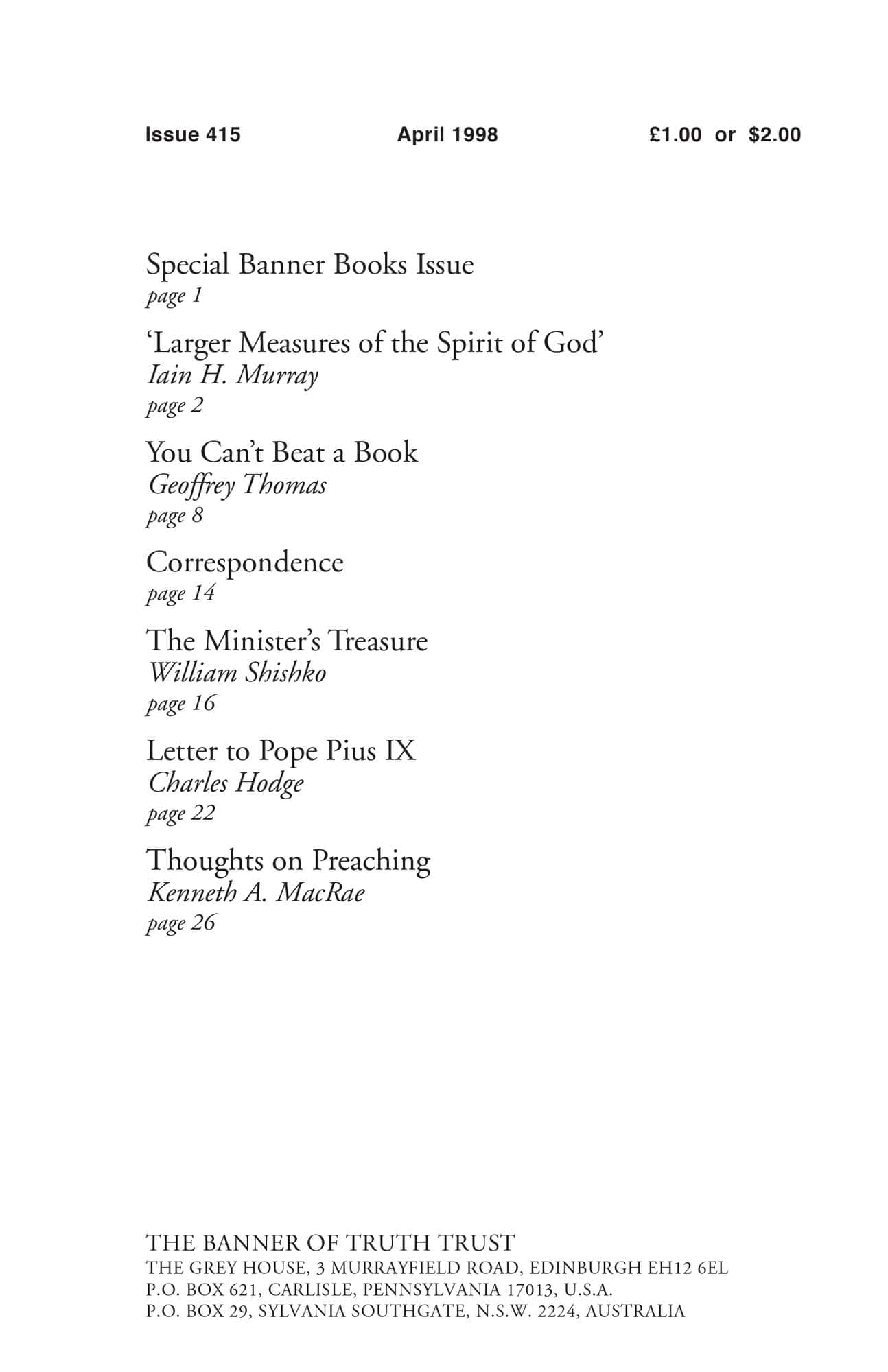| Larger Measures of the Spirit of God — Murray, Iain H | 2-7 |