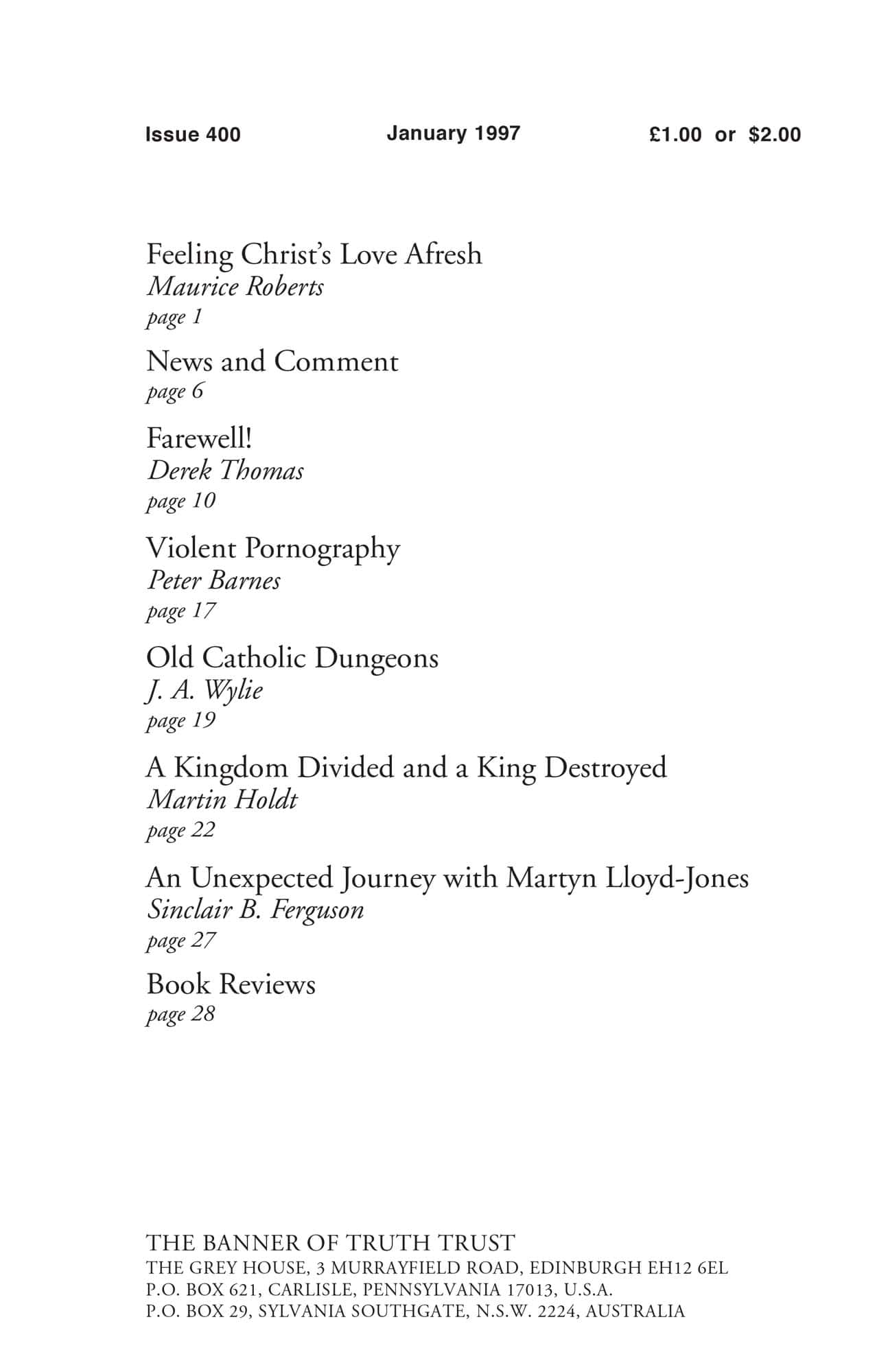 Subscribe to the Banner of Truth Magazine for 11 edifying issues each year (including summer double issue). Table of Contents Influence of Dr Lloyd-Jones on my Life and Ministry — De Vos, Leo 1-5 Doctor in Spanish: Jose de Segovia Barron 9-12 Word of Appreciation for ML-J from Germany — Klinner, Rainer 12 Raising the […]