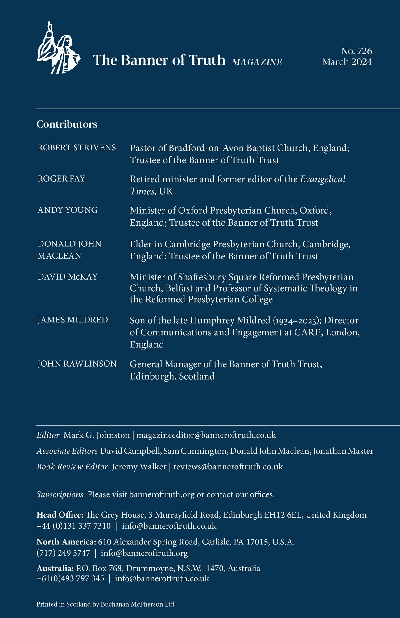 Table of Contents A Fine Man of a Past Century , Editor Bill Sykes and ‘That Little Bit’ , Archibald G. Brown News and Comment Hugh M. Cartwright (1943-2011) , Iain H. Murray Works Worth Declaring , Douglas Taylor Heavenly-Minded Usefulness , Sinclair B. Ferguson Book Reviews