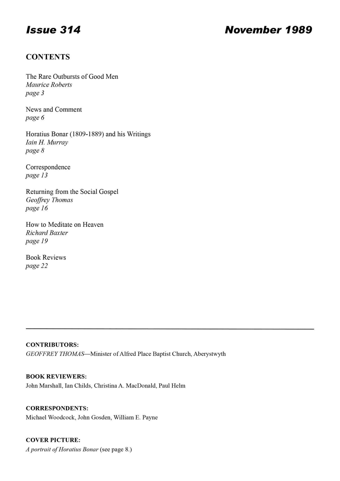 | Horatius Bonar (1808-1889) and his Writings — Murray, Iain H | 8-15 |