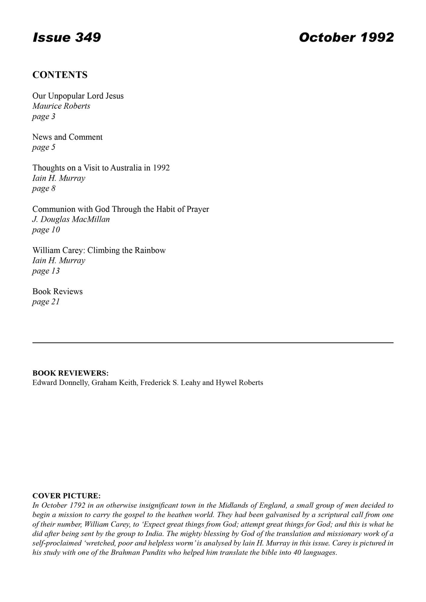 | Thoughts on a Visit to Australia in 1992 — Murray, Iain H | 8-11 |