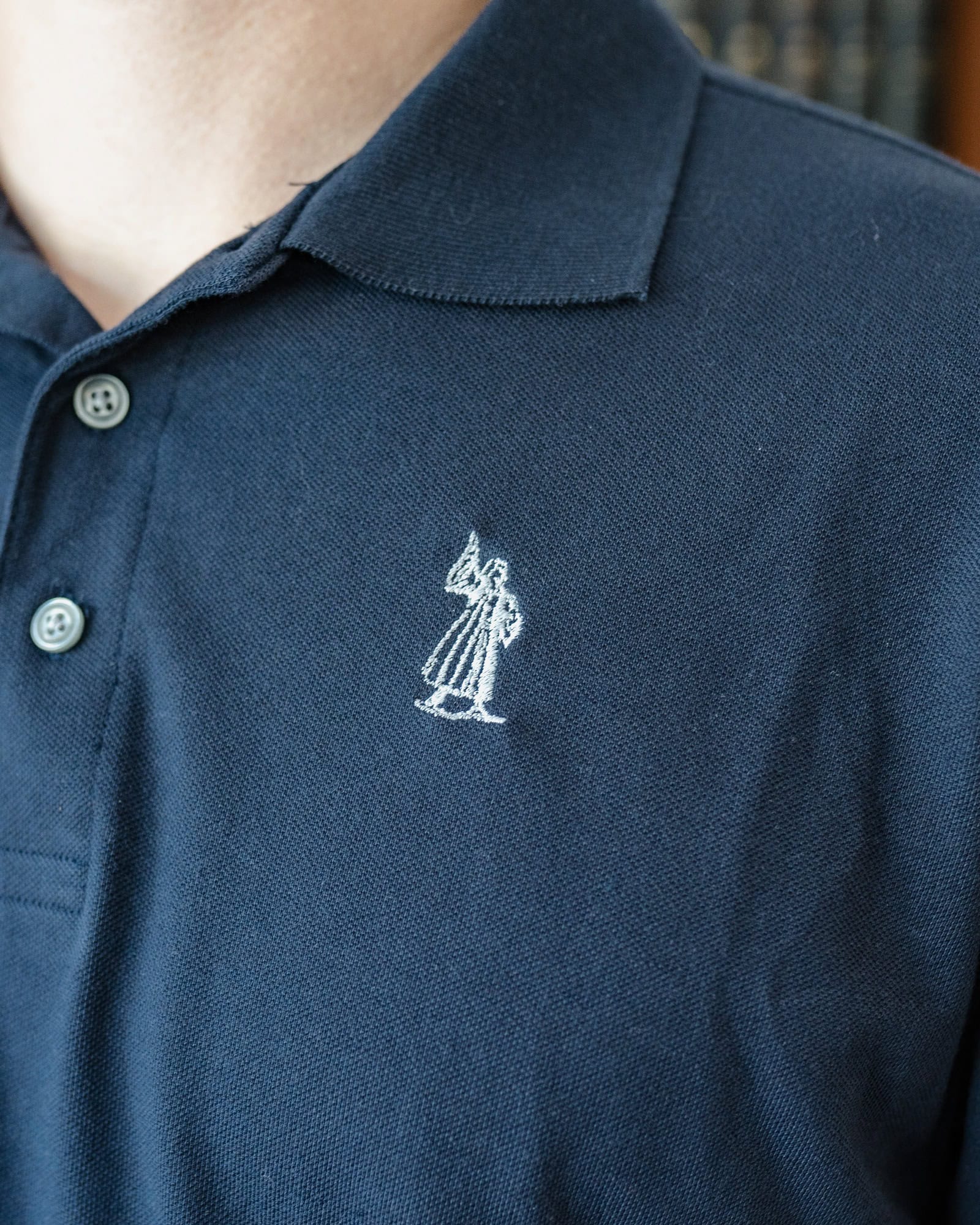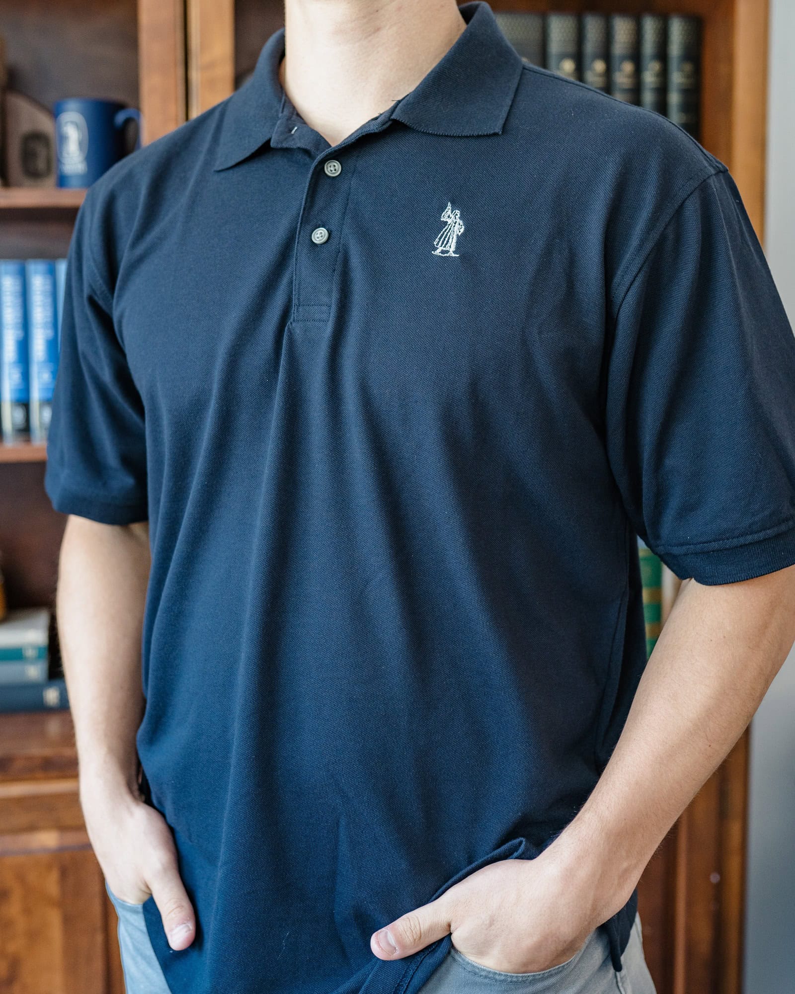A great conversation starter, this polo features a special blend of polyester with cotton, giving it a soft, silky hand and helping reduce shrinkage. This classic design features an embroidered George Whitefield on the front. Model is wearing a large.