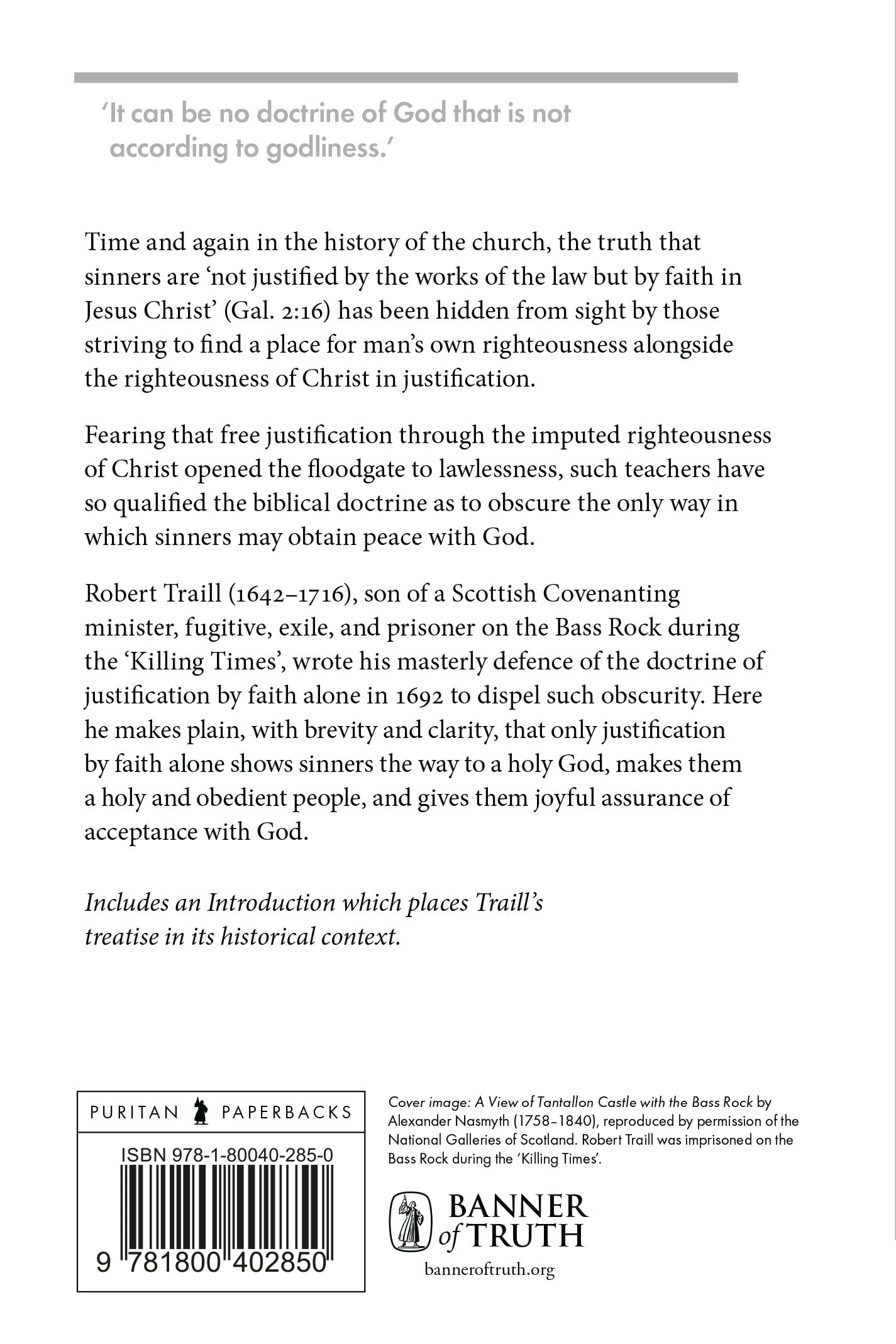 Robert Traill (1642–1716), son of a Scottish Covenanting minister, fugitive, exile, and prisoner on the Bass Rock during the ‘Killing Times’, wrote his masterly defence of the doctrine of justification by faith alone in 1692 to dispel such obscurity. Here he makes plain, with brevity and clarity, that only justification by faith alone shows sinners the way to a holy God, makes them a holy and obedient people, and gives them joyful assurance of acceptance with God.