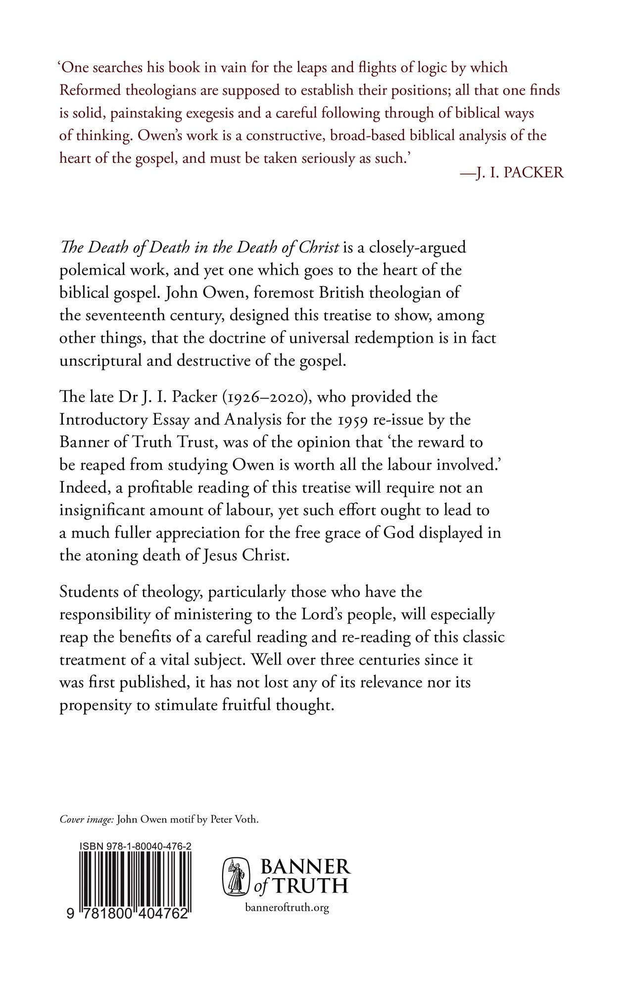 The Death of Death in the Death of Christ is a polemical work, designed to show, among other things, that the doctrine of universal redemption is unscriptural and destructive of the gospel. Those who see no need for doctrinal exactness and have no time for theological debates which show up divisions between Evangelicals may well regret its reappearance. Some may find the very sound of Owen’s thesis so shocking that they will refuse to read his book at all. But there are signs today of a new upsurge of interest in the theology of the Bible: a new readiness to test tradition, to search the Scriptures and to think through the faith. It is to those who share this readiness that Owen’s treatise is offered, in the belief that it will help us in one of the most urgent tasks facing Evangelical Christendom today-the recovery of the gospel.